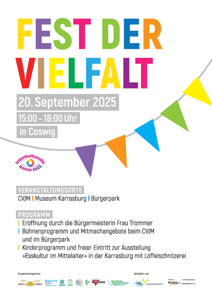 „Am 20.9.2025 feierten etwa 350-400 Aktive, Besucher und Besucherinnen bei herrlichem Sonnenwetter auf dem Gelände des CVJM e.V. Coswig ein fröhliches Fest der Vielfalt – und das bereits zum 11. Mal im Rahmen der Interkulturellen Wochen im Landkreis Meißen.